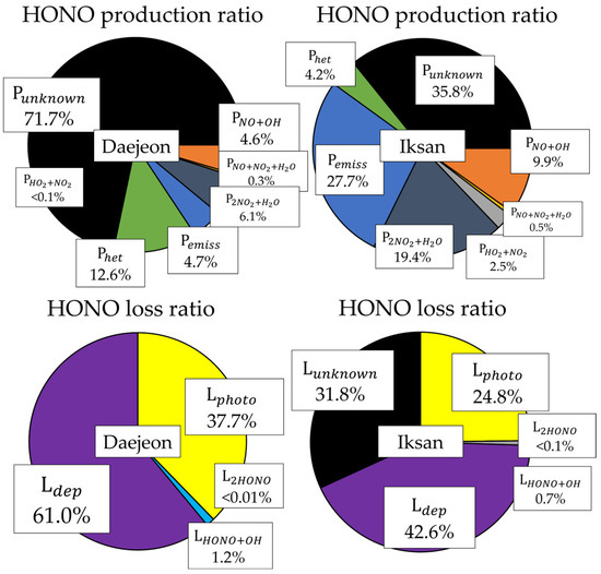 In Iksan, the contribution of Punknown was considerably lower at 35.8% (0.17 µg/m3·hr), suggesting a better representation of known sources in the model. Major formation pathways included Pemiss (27.7%, 0.13 µg/m3·hr) and P2NO2+H2O (19.4%, 0.09 µg/m3·hr), while PNO+OH contributed 9.9% (0.05 µg/m3·hr), more than twice the corresponding value in Daejeon. Other minor formation pathways included PHO2+NO2 (2.5%) and PNO+NO2+H2O (0.6%). For HONO loss in Iksan, dry deposition (Ldep) accounted for 42.7% (0.26 µg/m3·hr), and photolysis (Lphoto) 24.8% (0.15 µg/m3·hr), both lower than in Daejeon. However, the unknown loss pathway (Lunknown) represented a relatively large fraction (31.9%, 0.20 µg/m3·hr), indicating the potential involvement of uncharacterized reactions or model limitations under local atmospheric conditions.