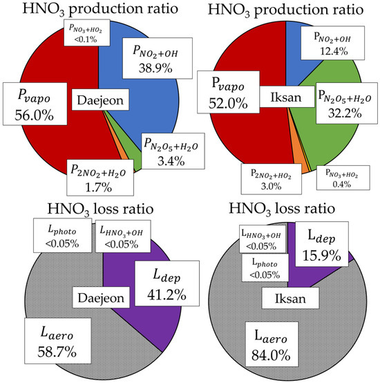 It should be noted that although this study focused on the aerosol conversion pathway of HNO3 via reaction with NH3, other chemical removal pathways—especially those contributing to the unexplained loss of HNO3 in Daejeon and Iksan—may exist. Thus, some degree of uncertainty remains inherent in this indirect estimation method.