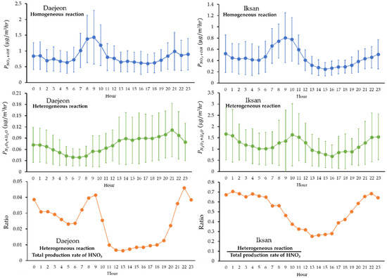Diurnal variations of HNO3 production rates by homogeneous and heterogeneous reactions in Daejeon and Iksan. Error bars represent standard deviations.