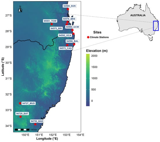 The study region encompasses the coastal and near-coastal zones of New South Wales (NSW) and southern Queensland (QLD) in eastern Australia (Figure 1). This region spans approximately 28° S to 31° S in latitude and 1521° E to 153.5° E in longitude, and includes a diverse range of terrain types such as coastal plains, low-relief hills, and the outset of the Great Dividing Range. Local wind regimes are influenced by sea-breeze circulations, orographic channelling along east–west valleys, and large-scale synoptic variability associated with the East Australian Current, El Niño–Southern Oscillation (ENSO), and mid latitude frontal systems [,].