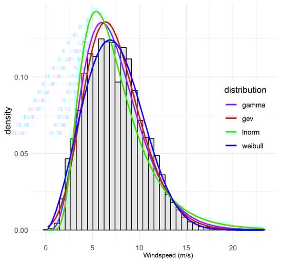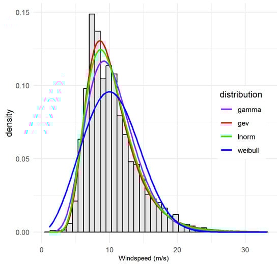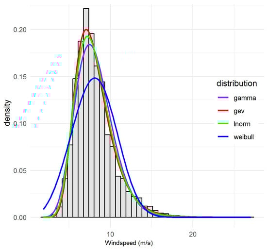 Historically, the Weibull distribution has dominated windspeed modelling due to its analytical tractability and relatively good fit to bulk flow metrics (mean, variance, skewness) across a wide array of sites []. However, numerous studies have documented its shortcomings in accurately reproducing low-wind and extreme-wind occurrences, which are critical for turbine cut-in and load-hazard calculations, respectively [,,]. Alternative marginal models—such as the Gamma, lognormal, and three-parameter Generalised Extreme Value (GEV) distributions—offer enhanced flexibility in tail representation but introduce additional parameters and potential overfitting risks [,,]. Moreover, the choice of parameter-estimation method (e.g., maximum likelihood vs. L-moments) can materially affect fitted shape and scale parameters, further complicating model selection [,].