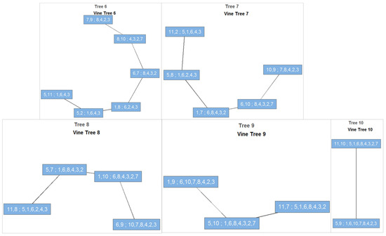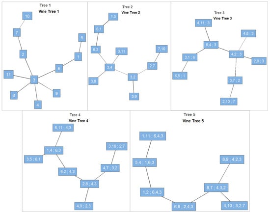 An R-vine on 11 variables is defined by a sequence of trees with edge-sets . The joint copula density factorises as