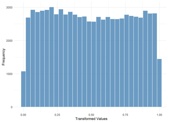 After cleaning, the pooled dataset comprises an n = 7289 × 11 daily matrix X, where Xi,t denotes the wind-speed at site i on day t. All wind speeds are measured at standard 10 m height above ground and converted to 10 m equivalent where necessary using the logarithmic wind-profile law []. Prior to copula analysis, each marginal time series was transformed to the unit interval via probability-integral transforms ensuring compatibility with vine-copula fitting [].
