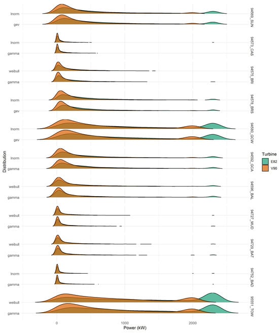 Univariate GoF testing typically combines information-criteria and Empirical Distribution Function (EDF)-based tests. Stephens [] formalised the Anderson–Darling (AD) and Cramér–von Mises (CvM) tests, which weight discrepancies between empirical and theoretical CDFs differently, with AD emphasising tails and CvM equally weighting across the support. Razali and Wah [] compared the Kolmogorov–Smirnov (KS), AD, and CvM tests using both simulated and real-world datasets, concluding that AD consistently outperforms the others in detecting tail departures, making it more suitable for tail-sensitive model discrimination. Evans et al. [] discussed the incorporation of resampling techniques, such as bootstrapping, to improve p-value accuracy for GoF tests under parameter uncertainty—particularly beneficial for small sample sizes (n < 1000), where classical test calibration can be unreliable. More recently, Chau et al. [] developed the adaptive bandwidth kernel density estimation (KDE) model to more accurately represent windspeed distributions for wind farm applications, particularly in complex terrains. Unlike traditional parametric methods, their non-parametric approach better captured the variability in windspeed data, especially in the tails of the distribution. They evaluated GoF using several statistical tests, highlighting the CvM test for its sensitivity across the entire distribution, including extremes, making it well suited for applications concerned with both energy yield and turbine design considerations.
