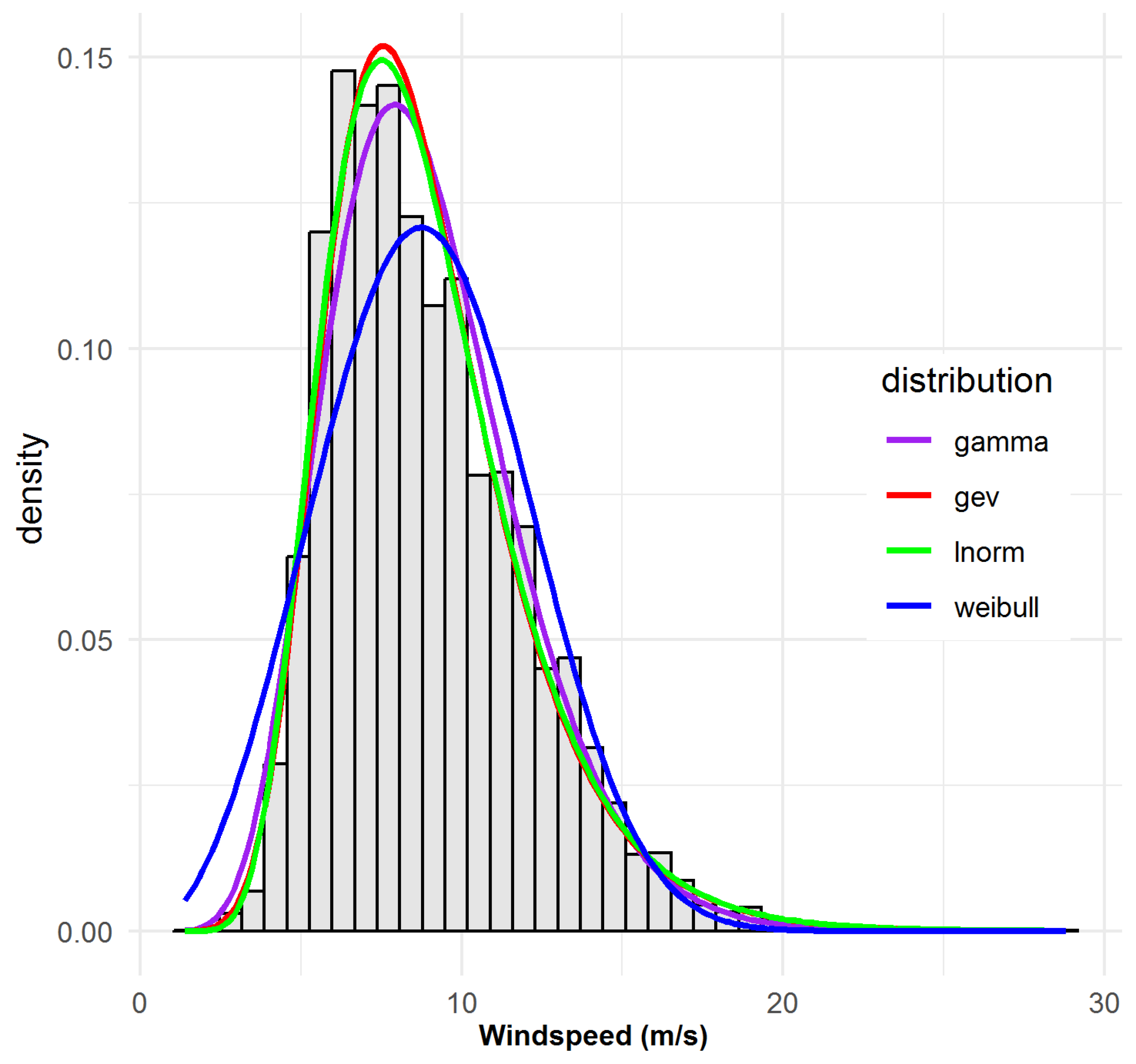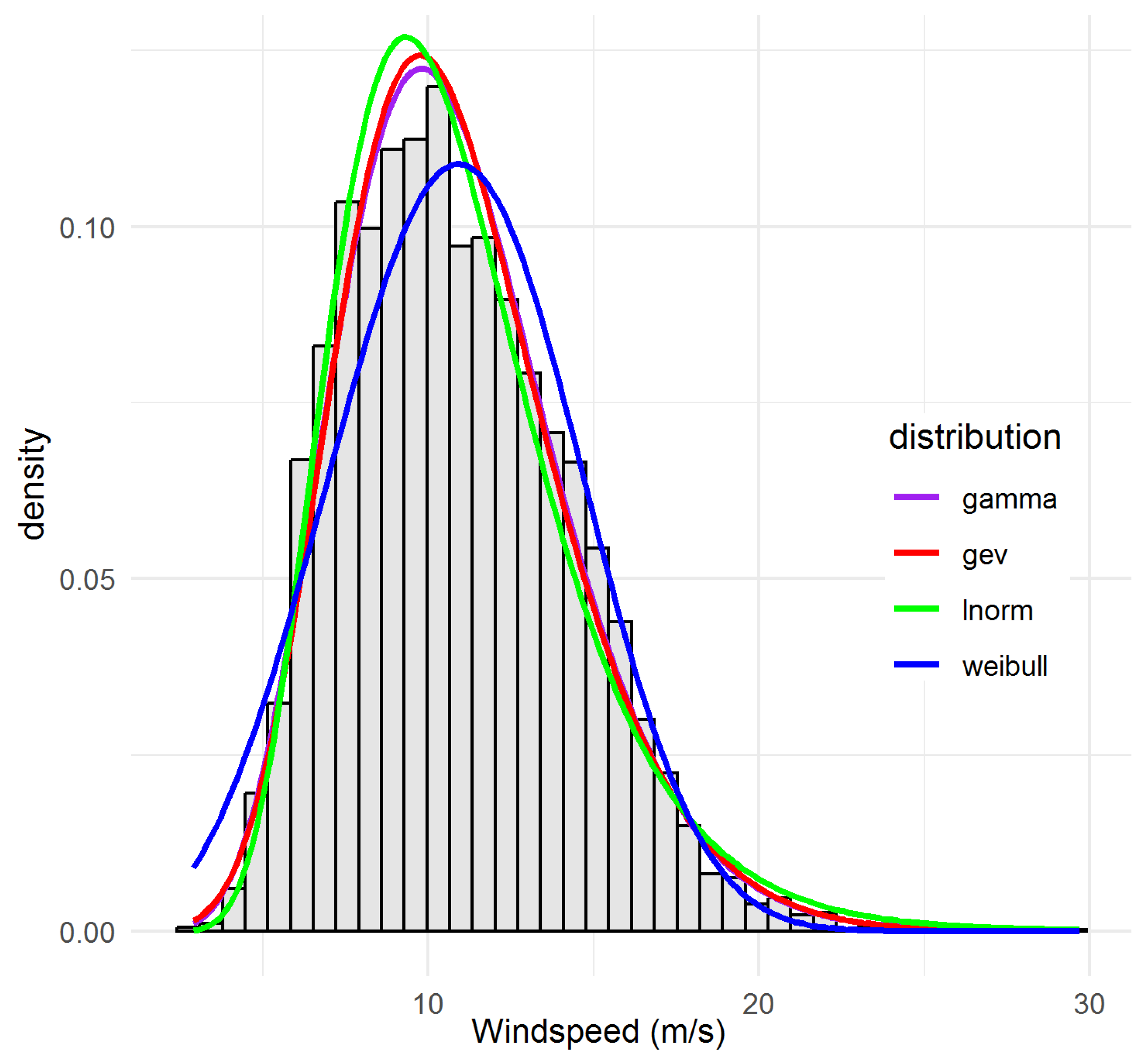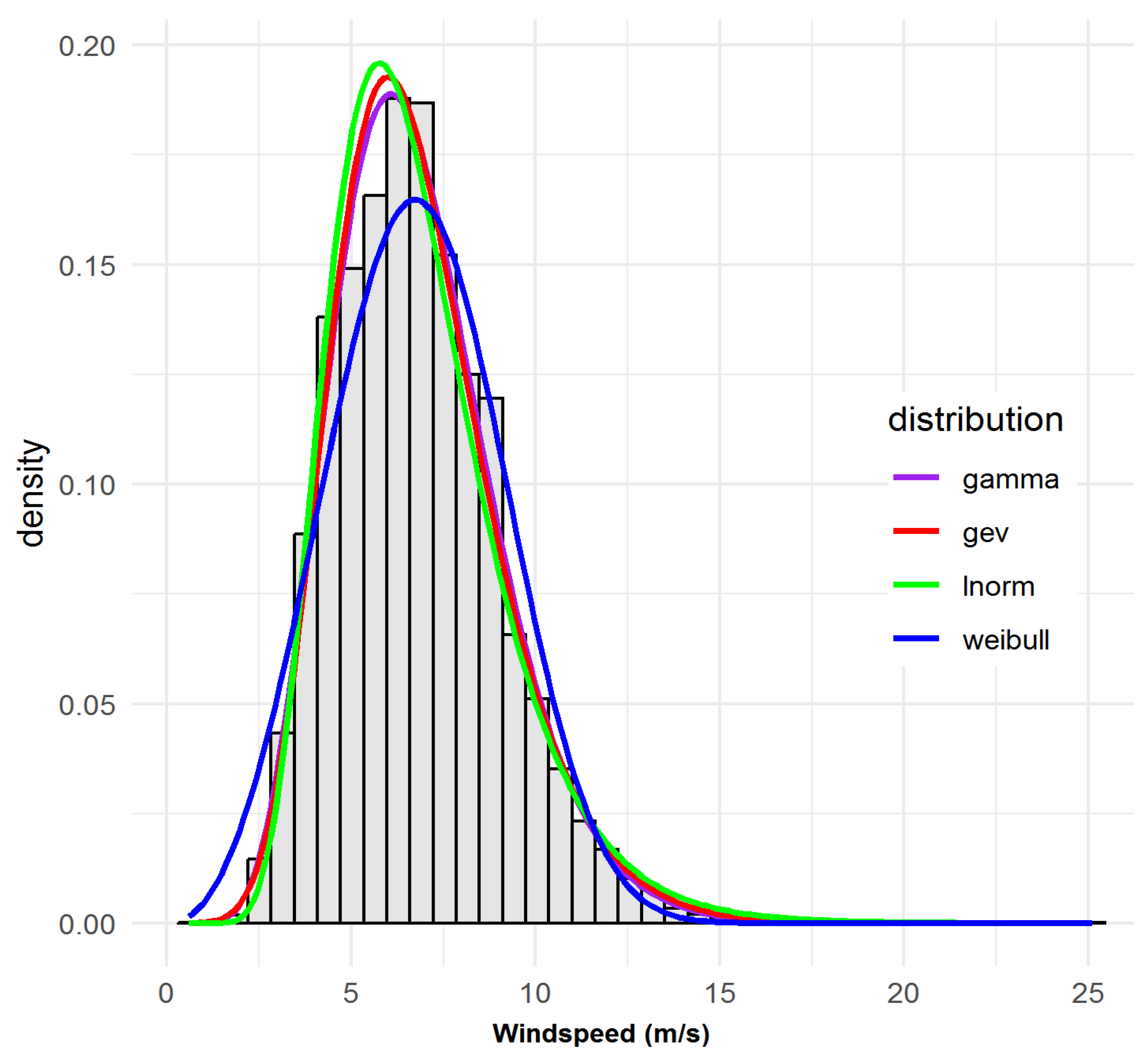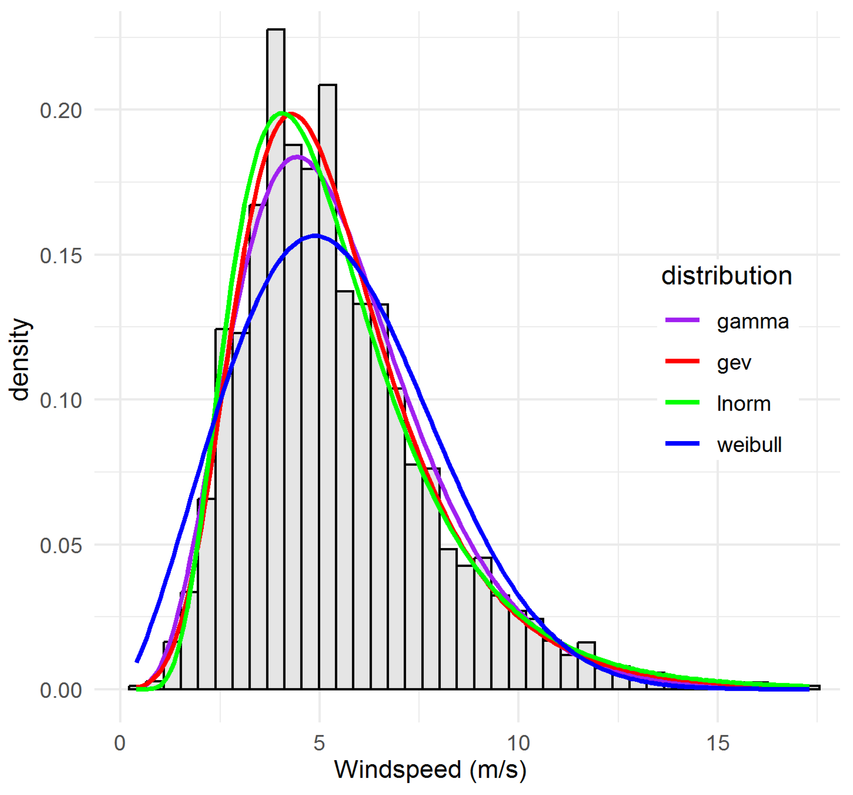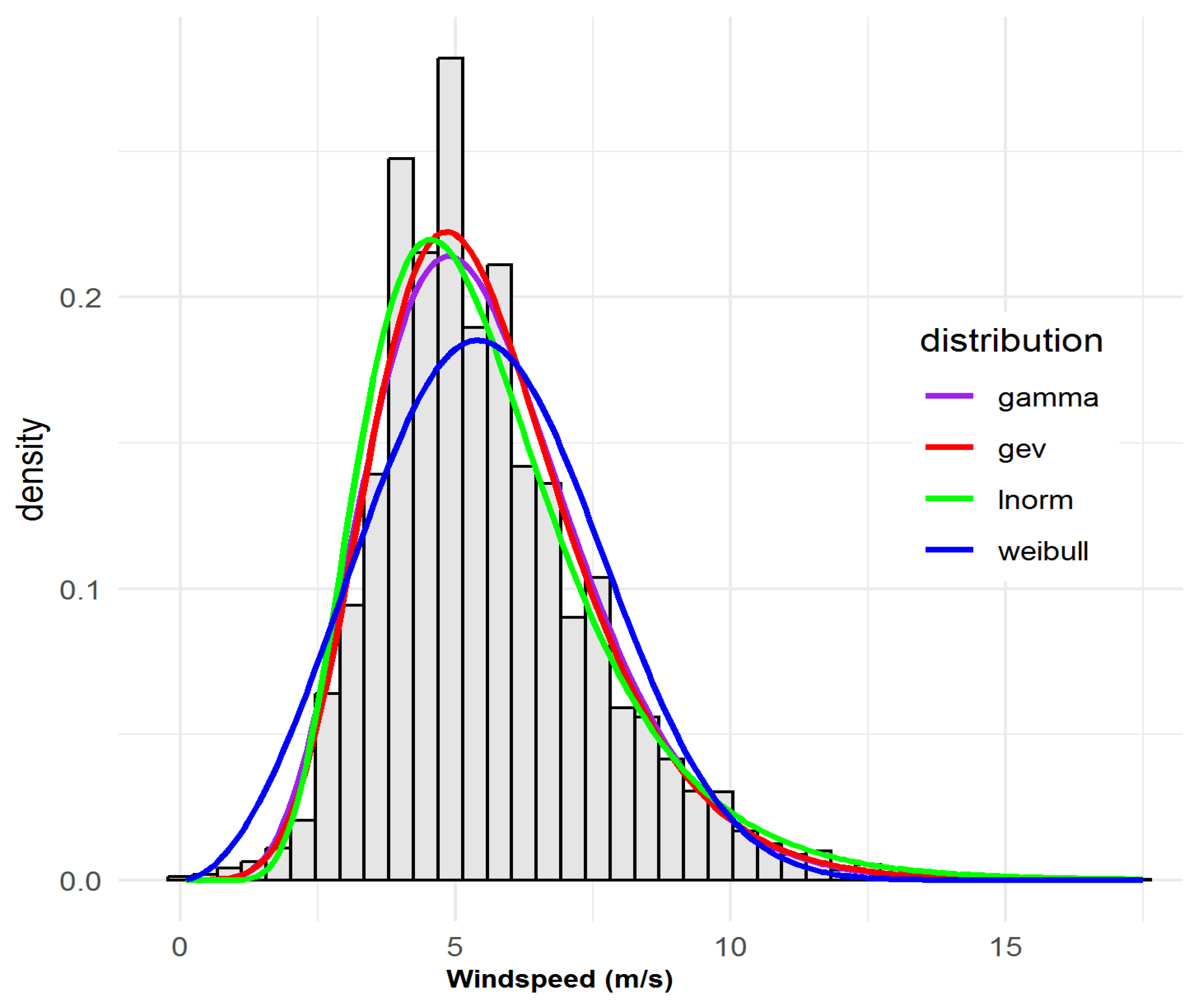 Historically, the Weibull distribution has dominated windspeed modelling due to its analytical tractability and relatively good fit to bulk flow metrics (mean, variance, skewness) across a wide array of sites [3]. However, numerous studies have documented its shortcomings in accurately reproducing low-wind and extreme-wind occurrences, which are critical for turbine cut-in and load-hazard calculations, respectively [4,5,6]. Alternative marginal models—such as the Gamma, lognormal, and three-parameter Generalised Extreme Value (GEV) distributions—offer enhanced flexibility in tail representation but introduce additional parameters and potential overfitting risks [7,8,9]. Moreover, the choice of parameter-estimation method (e.g., maximum likelihood vs. L-moments) can materially affect fitted shape and scale parameters, further complicating model selection [10,11].