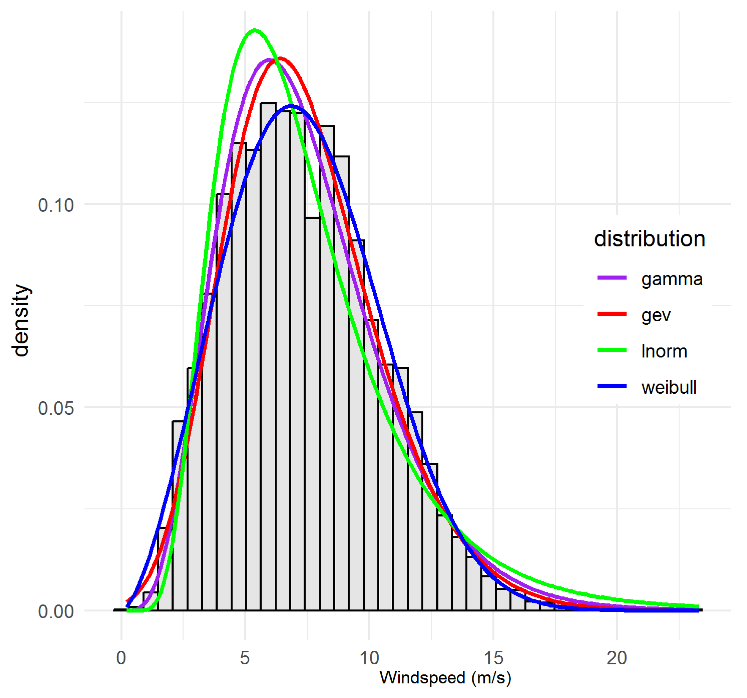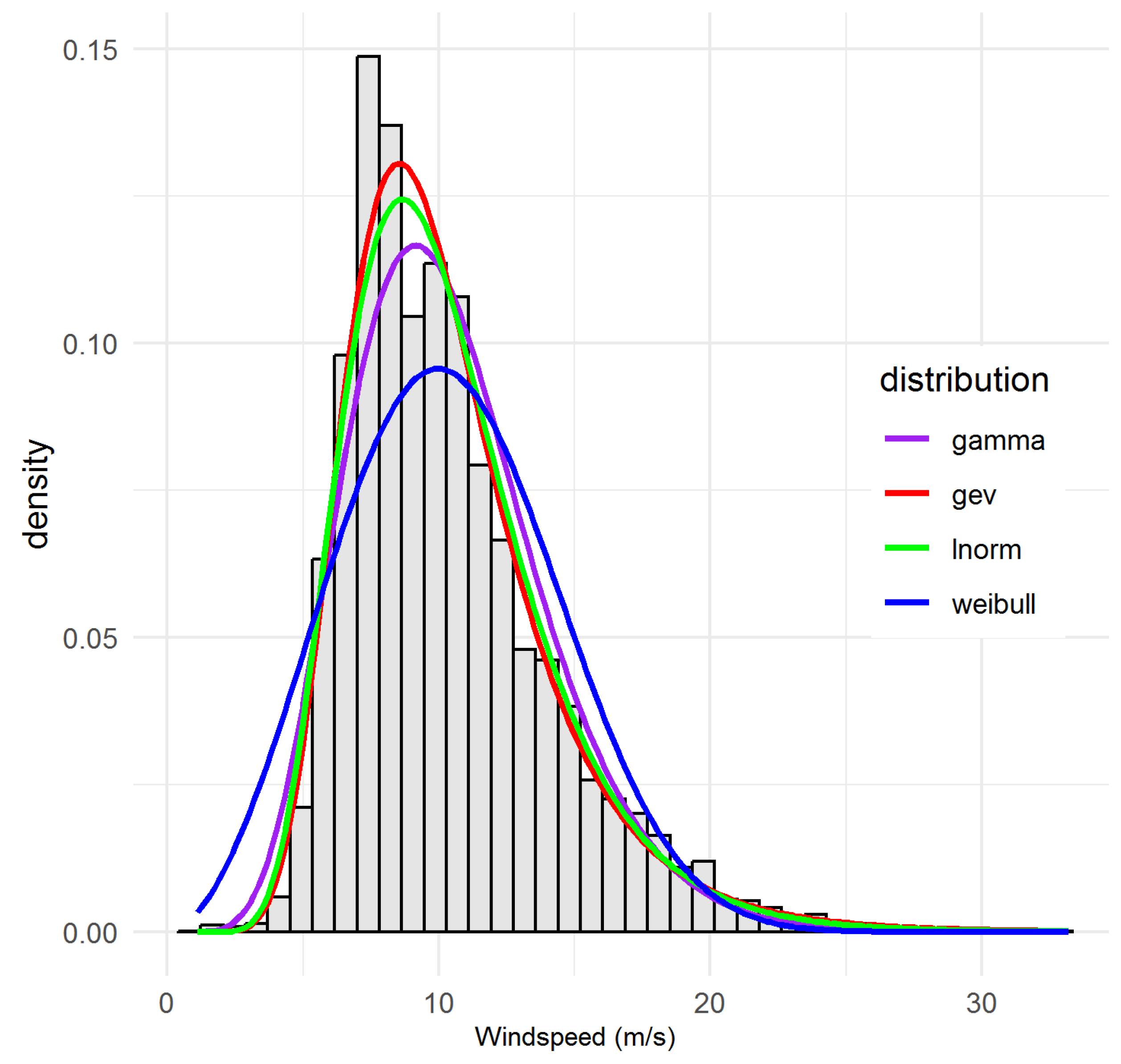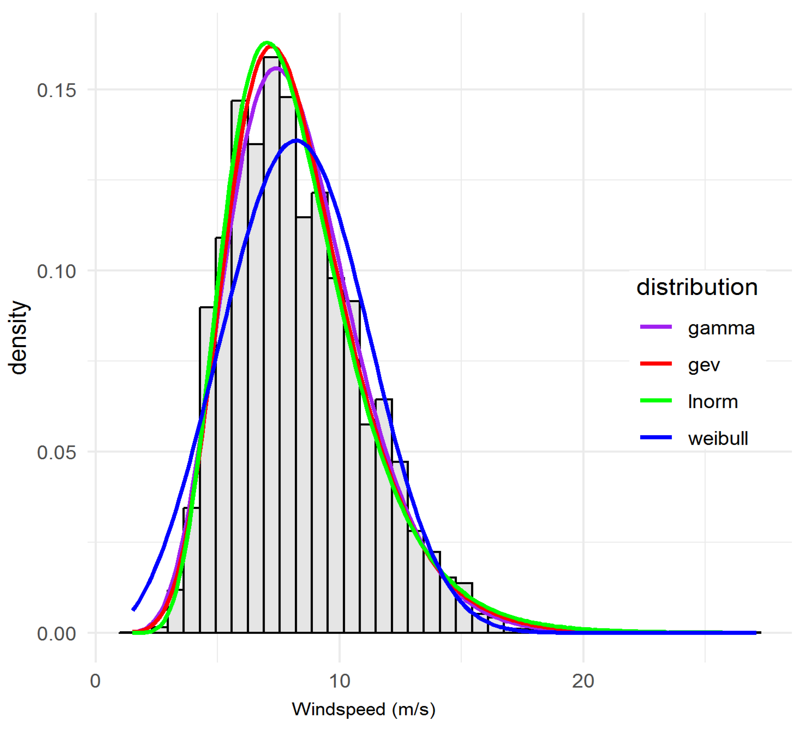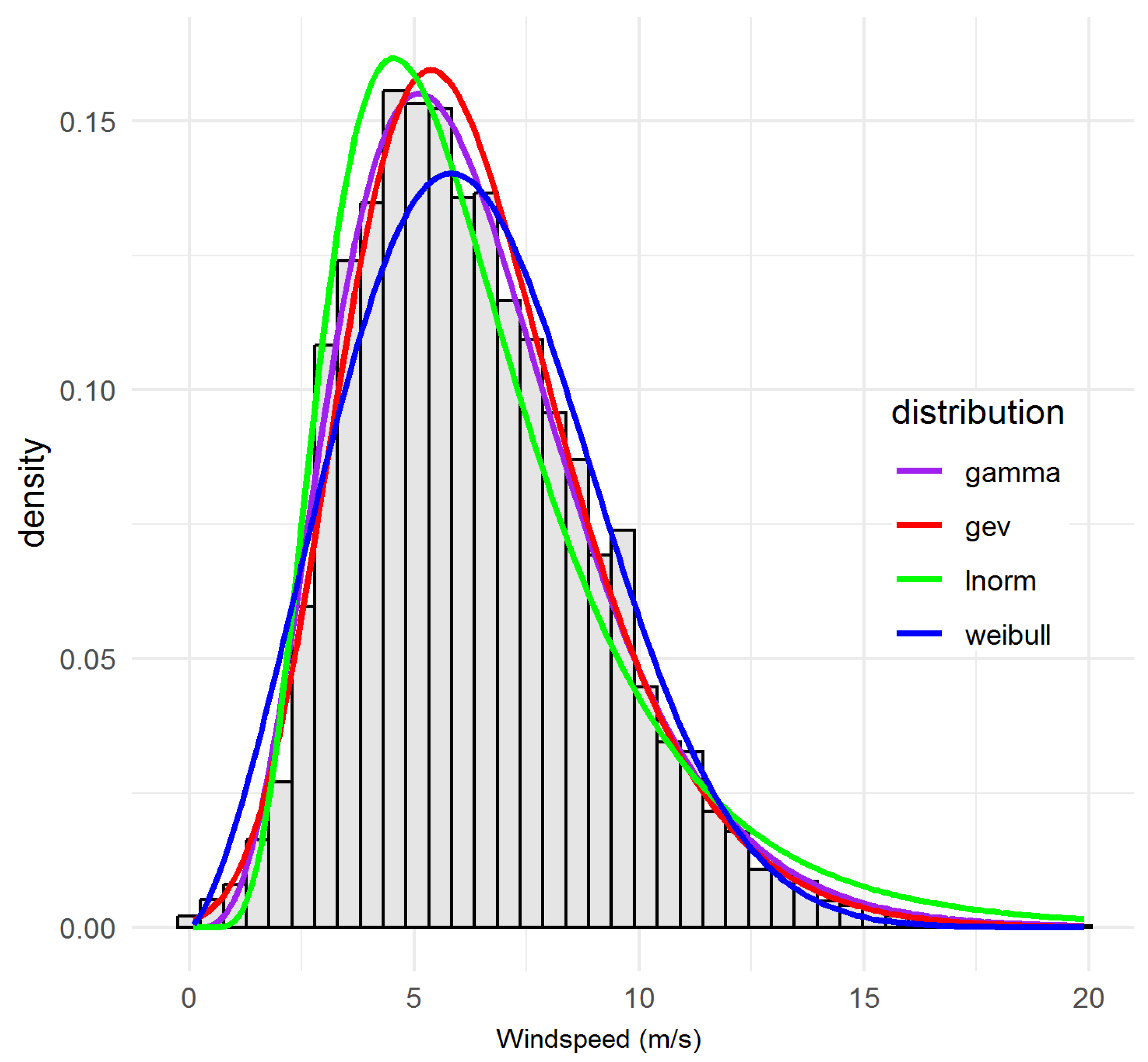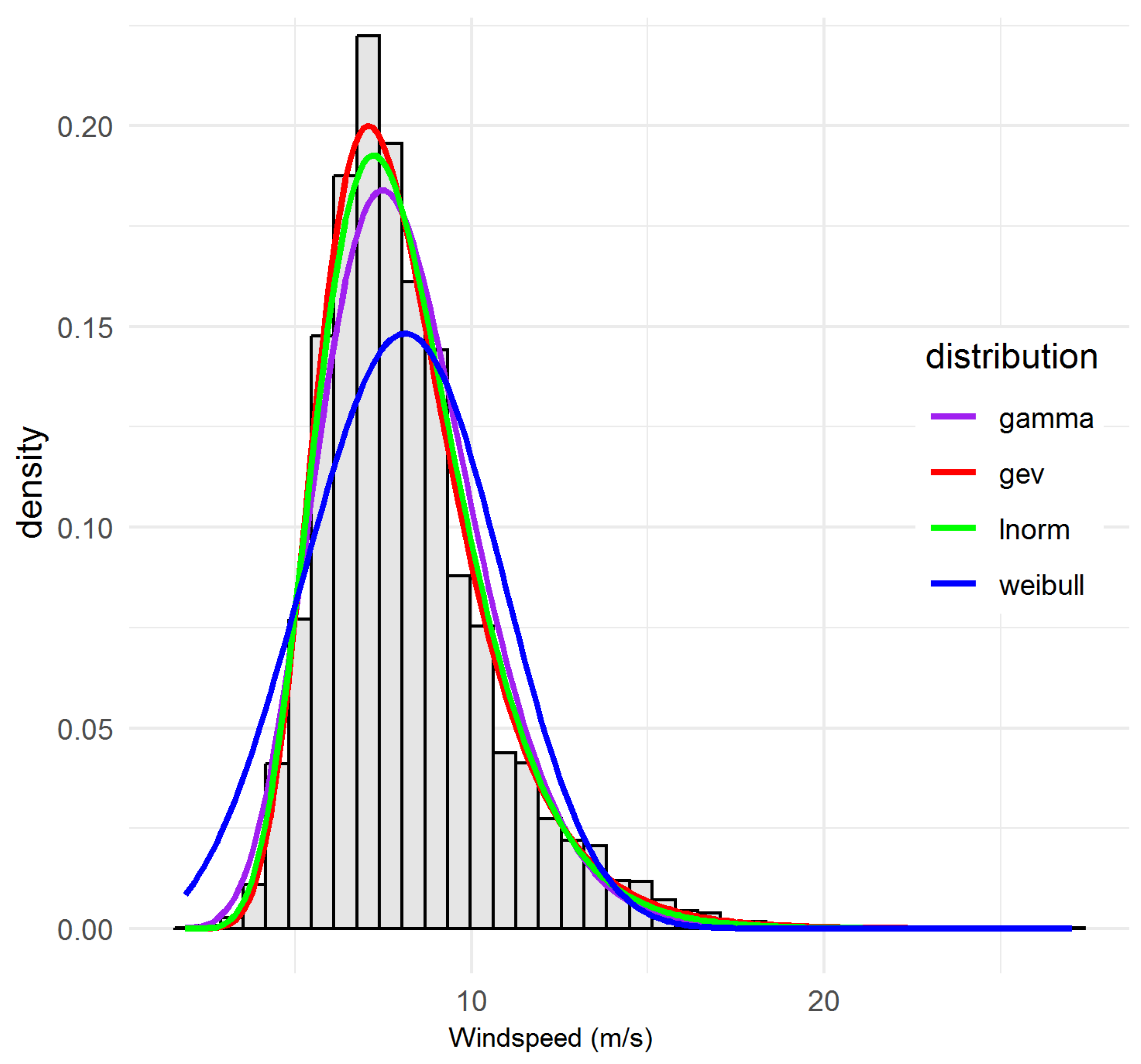 Historically, the Weibull distribution has dominated windspeed modelling due to its analytical tractability and relatively good fit to bulk flow metrics (mean, variance, skewness) across a wide array of sites [3]. However, numerous studies have documented its shortcomings in accurately reproducing low-wind and extreme-wind occurrences, which are critical for turbine cut-in and load-hazard calculations, respectively [4,5,6]. Alternative marginal models—such as the Gamma, lognormal, and three-parameter Generalised Extreme Value (GEV) distributions—offer enhanced flexibility in tail representation but introduce additional parameters and potential overfitting risks [7,8,9]. Moreover, the choice of parameter-estimation method (e.g., maximum likelihood vs. L-moments) can materially affect fitted shape and scale parameters, further complicating model selection [10,11].