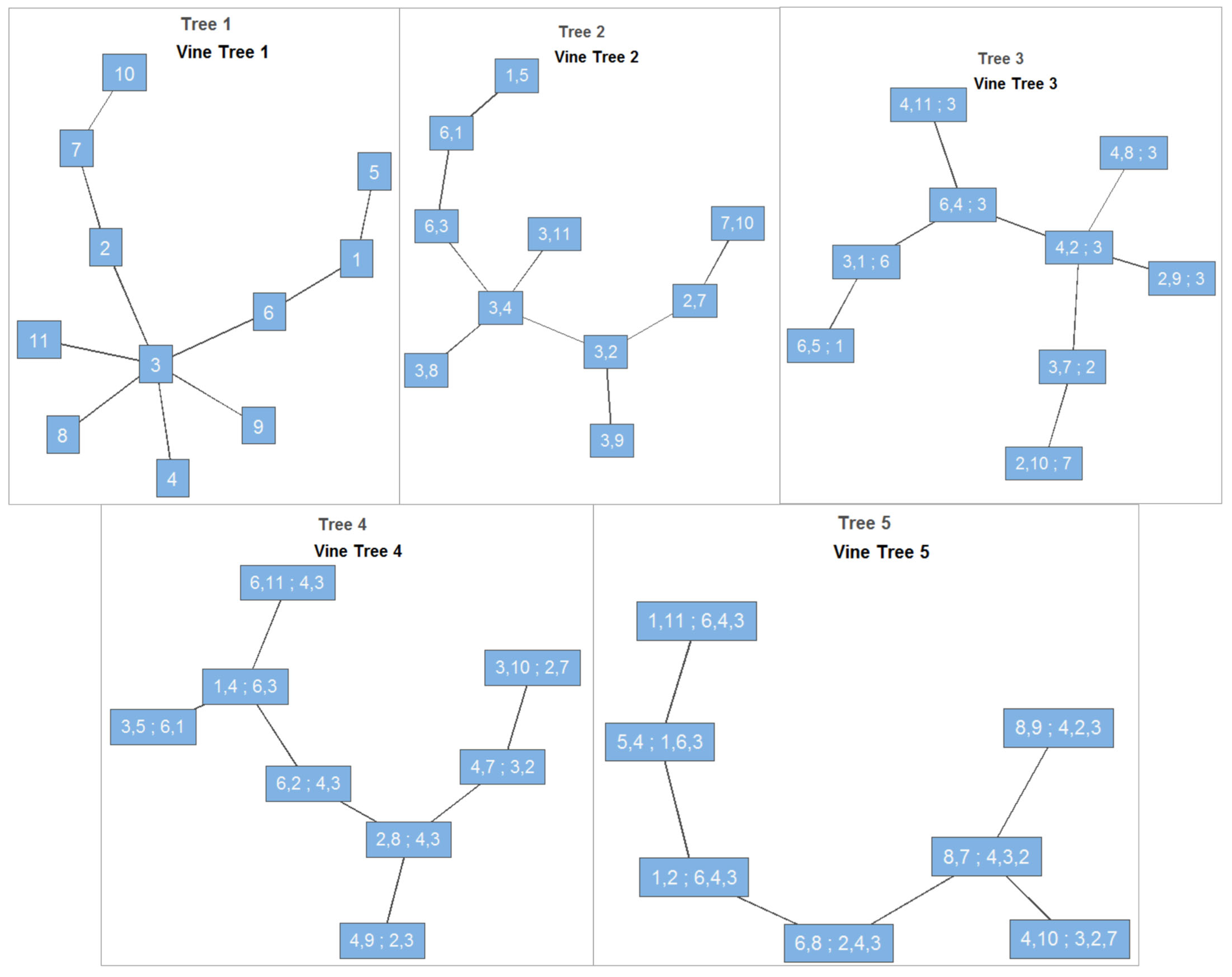 Figure 5. R-vine structure: Trees 1–5 for windspeed monitoring sites.