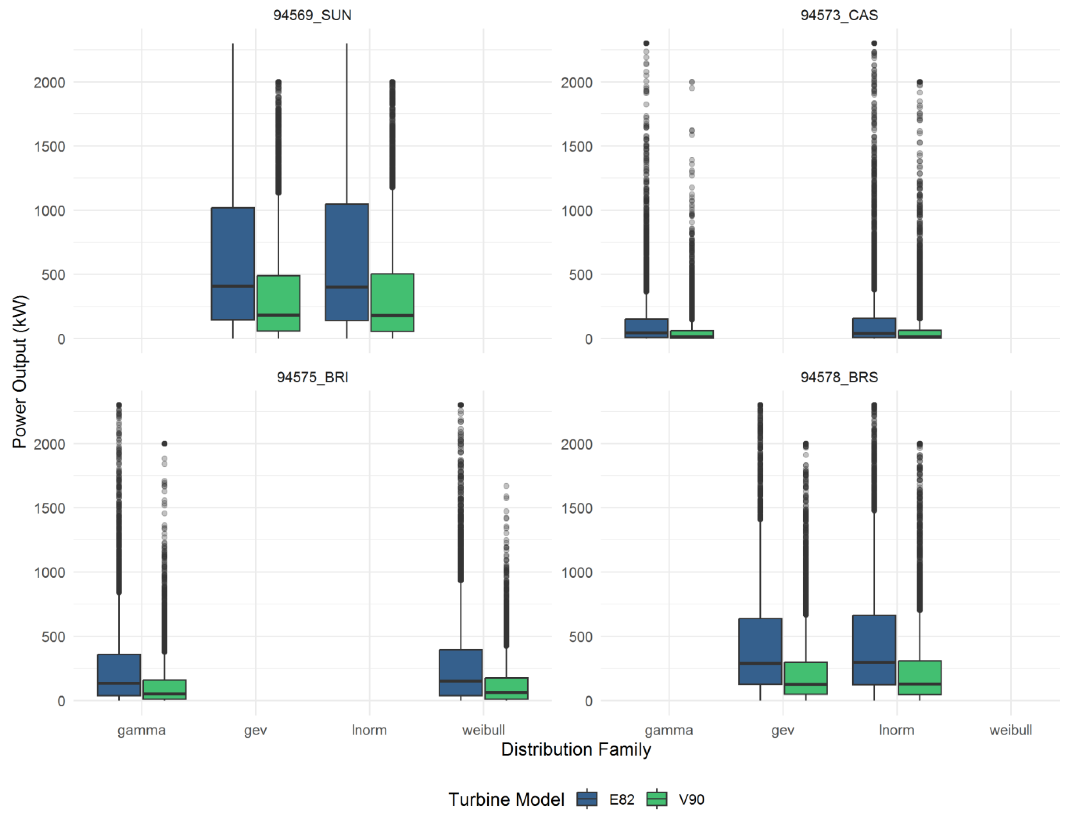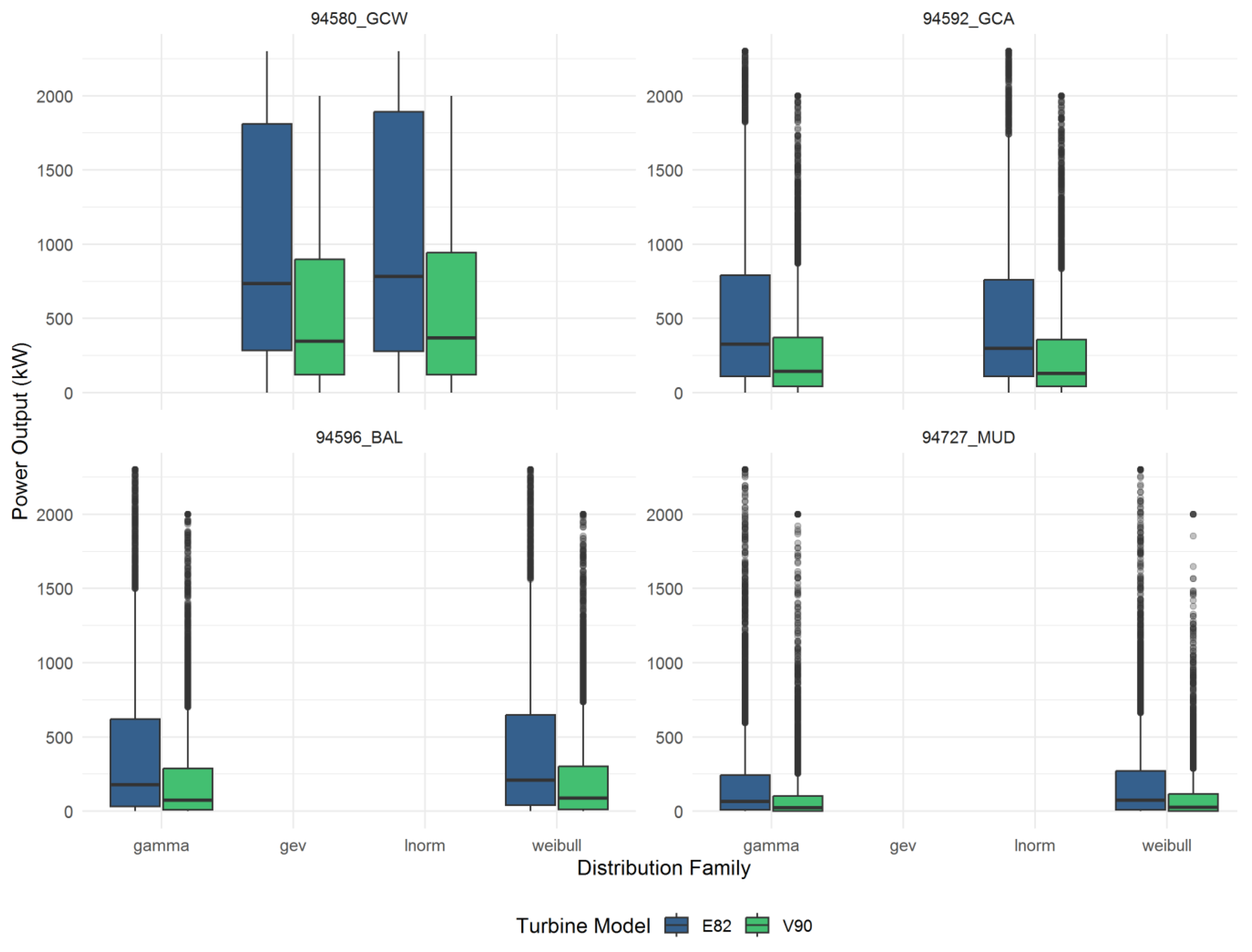 Figure 8. Boxplot for power output distribution family—95480_GCW, 94592_GCA, 94596_BAL, 94727_MUD.