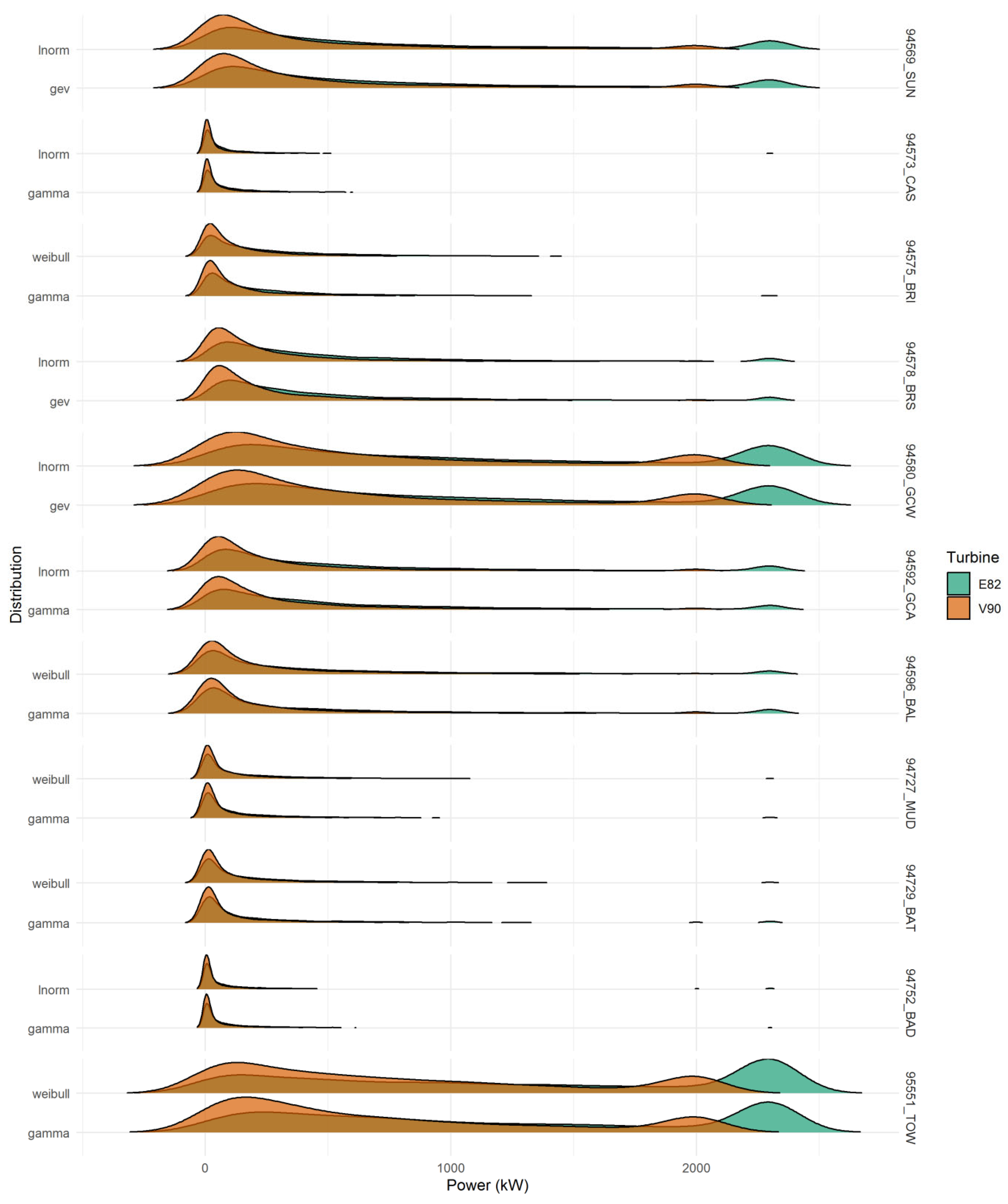 Figure 11. Ridgeline densities of annual energy yields (N = 5000) for each turbine–marginal combination across study sites. amber = E82; teal = V90.