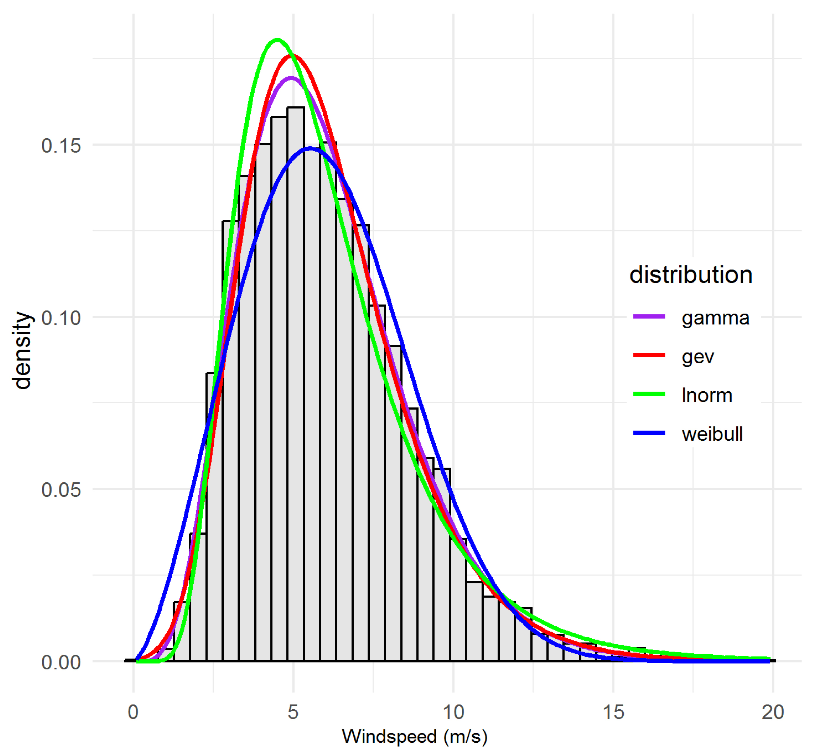 While the individual probability distributions employed (Weibull, Gamma, Lognormal, GEV) are well established, their systematic integration within a vine copula framework for windspeed analysis represents a methodological advance. The following formulations document the implementation for reproducibility, with emphasis on their role within the integrated goodness-of-fit (GoF) and spatial dependence modelling framework.
