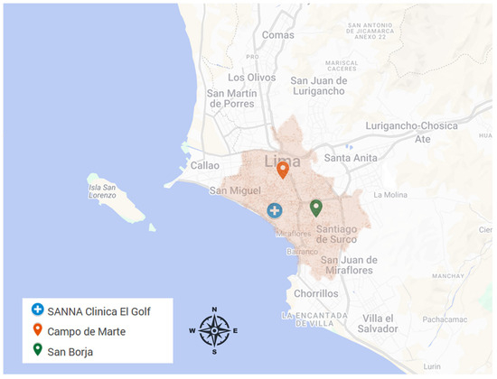 A Hirst-type Burkard volumetric 7-day spore trap (Burkard Manufacturing Co., Ltd., Rickmansworth, UK) was placed on the rooftop at a height of 20 m above ground level at SANNA Clínica El Golf, San Isidro, Lima, Perú (12°5′54″ S 77°3′6″ W; 129 m.a.s.l.) (Figure 1). This air sampler allowed for continuous monitoring of airborne particles, aiding in the creation of a more complete spore calendar. Monitoring was carried out from 1 January 2021 through 31 December 2024.