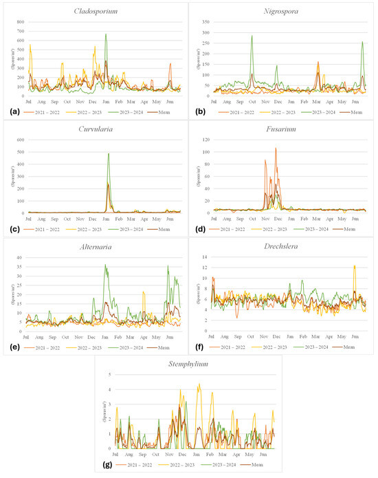 Seasonal variation (2021–2024; 5-day running mean). (a) Cladosporium; (b) Nigrospora; (c) Curvularia; (d) Fusarium; (e) Alternaria; (f) Drechslera; (g) Stemphylium.