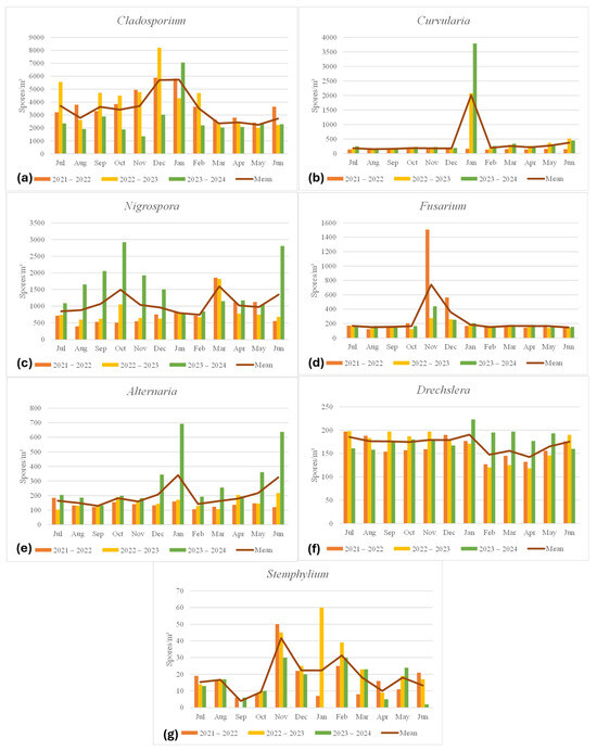 Of the seven spore types in this study, the most abundant was Cladosporium (mean MSS 37,945 spores/m3), followed by Nigrospora (11,558 spores/m3), Curvularia (3946 spores/m3), Fusarium (2454 spores/m3), Alternaria (2138 spores/m3), Drechslera (1850 spores/m3), and Stemphylium (201 spores/m3). Alternaria, Nigrospora, Curvularia, and Drechslera shared a similar trend where the highest concentrations were observed in 2023–2024 (3251 spores/m3; 17,090 spores/m3; 5956 spores/m3; and 1961 spores/m3, respectively), followed by 2022–2023 (1657 spores/m3; 8864 spores/m3; 4224 spores/m3; and 1821 spores/m3, respectively), and finally 2021–2022 (1506 spores/m3; 8719 spores/m3; 1659 spores/m3; and 1767 spores/m3, respectively). However, Cladosporium (44,172 spores/m3) and Stemphylium (251 spores/m3) had the highest concentrations in 2022–2023 (44,172 spores/m3 and 251 spores/m3, respectively) followed by 2021–2022 (41,299 spores/m3 and 189 spores/m3, respectively), and 2023–2024 (28,365 spores/m3 and 163 spores/m3, respectively), and Fusarium had the highest concentrations in 2021–2022 (3314 spores/m3), then 2023–2024 (2155 spores/m3), and then 2022–2023 (1893 spores/m3).