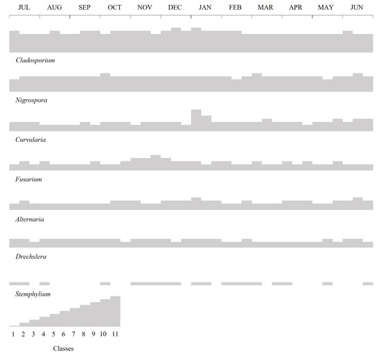Figure 4 shows the average spore concentrations, grouped in 10-day intervals for the seven spore types analyzed in this study, averaged over the three annual periods (2021–2024). At its highest concentration, Cladosporium reached class 8 (200–399 spores/m3) during the second 10-day period in December and during the first 10 days of January. The period from July to June showed mainly class 6 concentrations (50–99 spores/m3). Nigrospora reached class 6 concentrations (50–99 spores/m3) during the first 10 days of October and March and during the second 10-day period of June but maintained class 5 concentrations (25–49 spores/m3) throughout the rest of the year. Cladosporium and Nigrospora showed consistently high concentrations throughout the year; however, Curvularia had a distinct peak in the first 10 days of January, reaching class 7 (100–199 spores/m3), while the rest of the year had contrastingly low, mostly class 3 concentrations (6–11 spores/m3). Fusarium reached class 5 (25–49 spores/m3) during the last 10 days of November, but concentrations remained at class 2 (3–5 spores/m3) or class 3 (6–11 spores/m3) concentrations for the rest of the year. Alternaria had class 2 (3–5 spores/m3) and class 3 (6–11 spores/m3) concentrations for the majority of the annual period but reached a peak of class 4 (12–24 spores/m3) in the first 10 days of January and in the second 10 days of June. Drechslera alternated between class 2 (3–5 spores/m3) and class 3 (6–11 spores/m3) concentrations throughout the annual period, while Stemphylium only reached class 1 concentrations for half of the year (1–2 spores/m3).