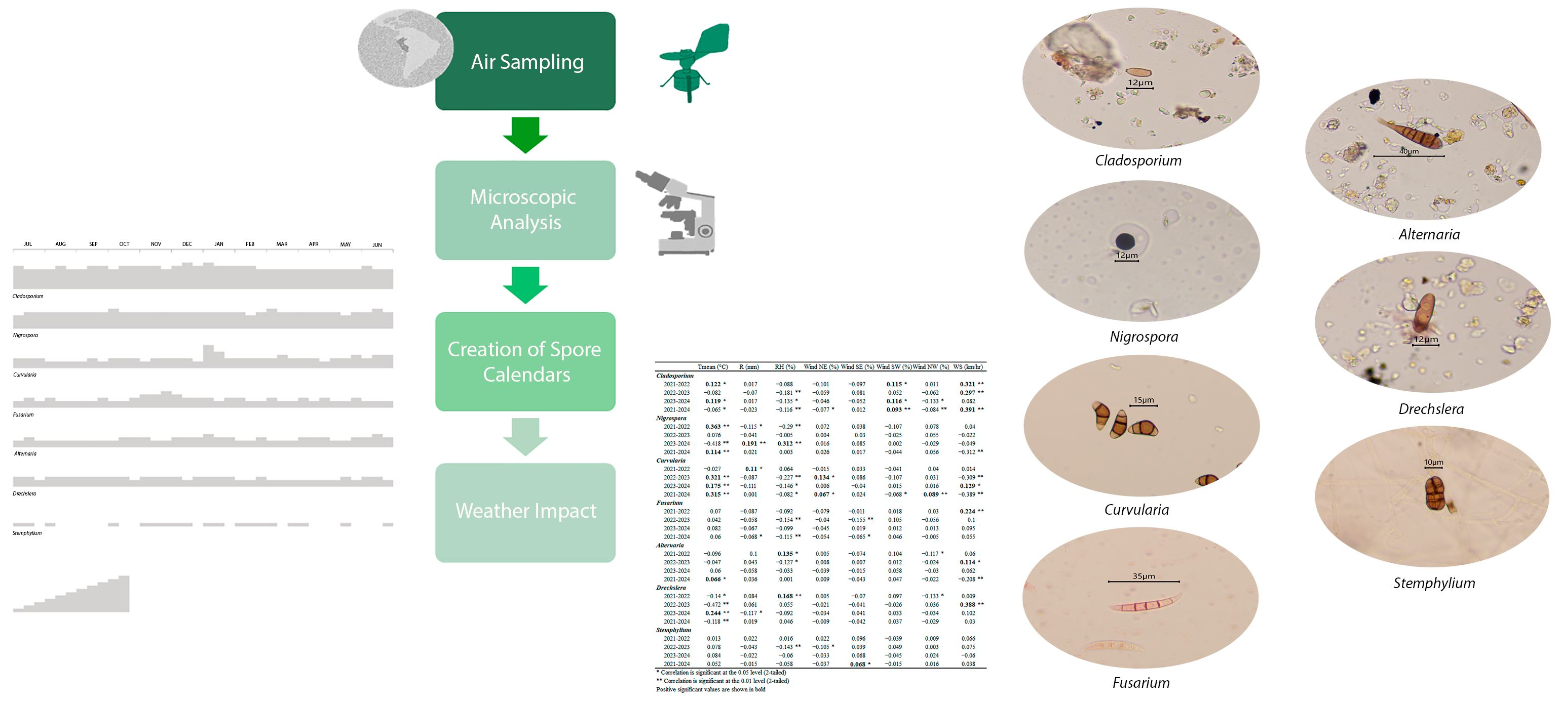 Comprehensive studies would entail the creation of a calendar that tracks the start and end dates of each identified spore type as well as its concentration throughout the year and would also identify the total atmospheric concentrations, including those of unidentifiable particles. Data collection would span several years to allow for the study of yearly and seasonal variability, as well as to study the impacts that meteorological parameters and climate change could have on the allergen data. Identifying total atmospheric concentrations rather than just allergens of clinical importance would allow researchers, clinicians, and patients to identify the proportion of each allergen to the total concentration of particles at a given time and place. This study aims to provide a more comprehensive understanding of the seasonality and abundance of these clinically important aeroallergens.