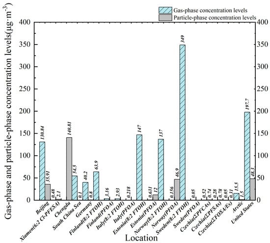 Up to now, research on the environmental pollution characteristics of PFASs in China and other countries has mainly focused on water bodies and soil, while studies on PFASs in the atmosphere are relatively scarce. The atmosphere is vital for human survival, and atmospheric transport is also one of the important pathways for PFAS transport. The distribution of PFASs (Table 2) in the gas and particle phases affects their form and deposition mode in the atmosphere. However, compared with water bodies and sediments, research on monitoring PFASs in the atmosphere is still very limited. On the one hand, most PFASs have low volatility, and only a few precursor compounds such as FTOHs and sulfonamide ethanol can exist in the atmosphere in a gaseous or granular form, thereby limiting the number of target species that can be monitored. On the other hand, the concentration of PFASs (Figure 2) in the atmosphere is usually at the pg/m3 level, posing extremely high requirements for sampling and detection sensitivity. In addition, PFASs are prone to complex photochemical transformations in the atmosphere, generating multiple intermediates and stable end products, which increase the uncertainty of monitoring and traceability. Although there is already evidence indicating that long-distance atmospheric transmission is an important pathway for the global distribution of PFASs, the current related monitoring data still display fragmented and unsystematic characteristics, causing atmospheric research to lag significantly behind that focused on other environmental media [16]. In previous atmospheric research on PFASs, reports from outside China have mainly focused on developed coastal countries such as northwest Europe, the United Kingdom, Germany, and the United States. However, this research has been ongoing for over a decade, lacking long-term and sustained monitoring and detection. Research on PFASs in the atmosphere in China has accelerated in the past decade, but related studies remain limited, with the main research sites including coastal cities such as Tianjin, Yantai, and Xiamen, as well as some areas in the South China Sea or near pollution sources such as factories.