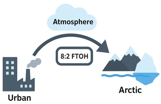 The long-distance atmospheric transport of PFASs is an important factor influencing their distribution in a region. Many PFASs, such as FTOHs and PFCAs, have relatively high vapor pressures and can exist in gaseous form in the atmosphere and be transported over long distances. For example, the atmospheric retention time of 8:2 FTOH can reach 80 days, which is sufficient for its global spread. The global production of 8:2 FTOH is approximately 5 × 106 kg per year, of which 40% is produced in North America [32]. In the abovementioned study on the Arctic, the average ratio of 8:2, 10:2, 6:2, and 12:2 FTOHs in the atmosphere was 4.8:0.9:1.0:0.4. This ratio was higher than that in urban areas (Toronto: 1.1:0.2:1.0), indicating that FTOHs mainly reached the Arctic through long-distance (Figure 3) atmospheric transport, demonstrating that this is a key factor affecting the distribution of PFASs in the Arctic [20]. Recent research in a factory in the Netherlands [33] showed that PFASs such as HFPO-DA (GenX) can be transported over long distances through the atmosphere, with model predictions showing that HFPO-DA can still be detected thousands of kilometers away from the Dordrecht factory—for example, the annual deposition in Reykjavik, Iceland, is 0.5–2.4 ng·m−2yr−1. This research also found that wind direction is one of the influencing factors in PFAS concentration—when the wind blows from the direction of the factory, the PFAS concentration in the air increases significantly.
