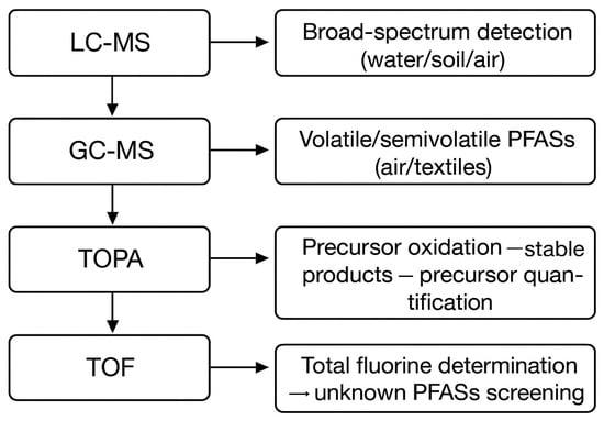 Other auxiliary technologies include TOPA and TOF. TOPA is the process of converting unknown PFAS precursors into detectable final products using strong oxidants such as persulfates. TOF is used to determine the total fluorine content by means of combustion ion chromatography (CIC) or particle-induced gamma-ray emission (PIGE). Both of these methods enable the quantitative analysis of PFAS precursors in environmental samples, filling the gap in the reference standards.