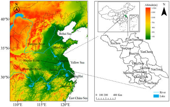 As shown in Figure 1, Jiangsu Province, includes 13 prefecture-level cities (Nanjing, Wuxi, Xuzhou, Changzhou, Suzhou, Nantong, Lianyungang, Huai’an, Yancheng, Yangzhou, Zhenjiang, Taizhou, Suqian), is located in the middle of the eastern coastal areas of mainland China, the lower reaches of the Yangtze River and Huaihe River, the Yellow Sea in the east, Shandong in the north, Anhui in the west, Shanghai and Zhejiang in the southeast. It is an important part of the Yangtze River Delta region. Jiangsu Province spans 30°45′–35°08′ north latitude and 116°21′–121°56′ east longitude with a maximum altitude of 624.4 m. The terrain of Jiangsu Province is flat, and the landform is composed of plains, waters and low hills. Jiangsu Province is situated in the East Asian monsoon climate zone, which is located in the transition zone between the subtropical and warm temperate climates. Bounded by the Huaihe River and the Northern Jiangsu Irrigation Canal, the northern area of Jiangsu Province has a warm temperate, humid, and semi-humid monsoon climate. In contrast, the southern region has a subtropical, humid monsoon climate.