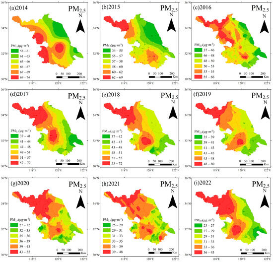 Annual distribution of PM2.5 mean mass concentration in Jiangsu from 2014 to 2022. (a) 2014; (b) 2015; (c) 2016; (d) 2017; (e) 2018; (f) 2019; (g) 2020; (h) 2021; (i) 2022.