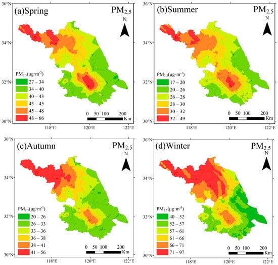 Seasonal distribution of PM2.5 mean mass concentration in Jiangsu from 2014 to 2022. (a) Spring; (b) Summer; (c) Autumn; (d) Winter.
