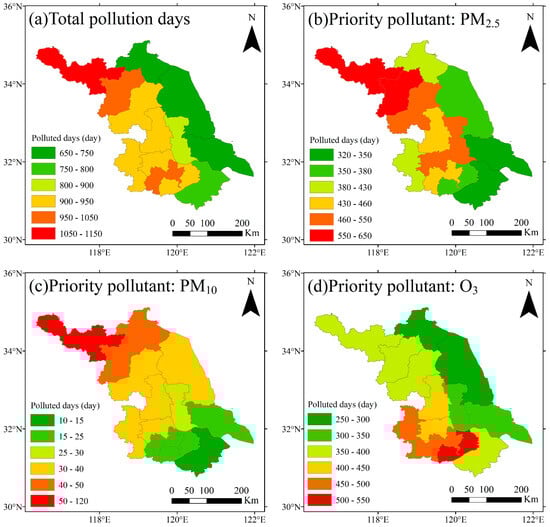 Distribution of pollution days in Jiangsu from 2014 to 2022. (a) Total pollution days; (b) Priority pollutant: PM2.5; (c) Priority pollutant: PM10; (d) Priority pollutant: O3.