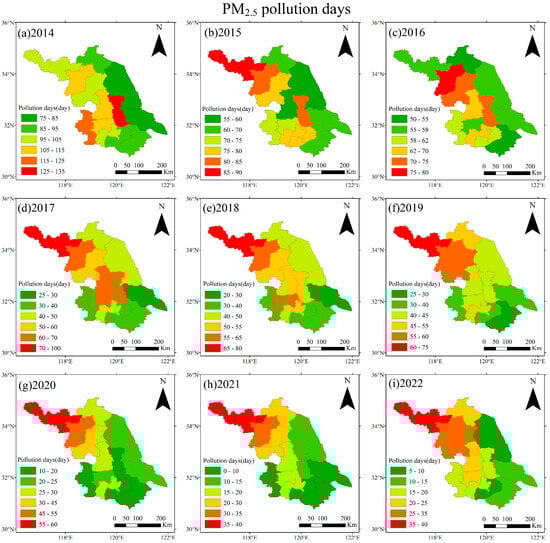 Annual distribution of PM2.5 pollution days in Jiangsu from 2014 to 2022. (a) 2014; (b) 2015; (c) 2016; (d) 2017; (e) 2018; (f) 2019; (g) 2020; (h) 2021; (i) 2022.