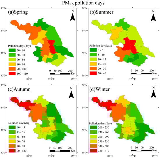 Seasonal distribution of PM2.5 pollution days in Jiangsu from 2014 to 2022. (a) Spring; (b) Summer; (c) Autumn; (d) Winter.