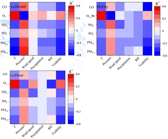 Figure 8 shows the Correlation between air pollutants mass concentrations and meteorological factors at different scales. At the monthly scale, PM2.5, PM10, NO2, CO, and SO2 were negatively correlated with temperature, with a correlation coefficient of −0.73 between PM2.5 and temperature. The increase in temperature will promote the activity of atmospheric molecules, causing pollutants to diffuse and dilute more easily, thereby reducing their concentration [44]. There was a significant positive correlation between O3 and temperature (R = 0.80). The photochemical reaction efficiency of volatile organic compounds was higher at higher temperatures, which was conducive to the formation of O3 [42]. The Correlation between pollutants and pressure is essentially positive. There was a weak negative correlation between PM2.5, PM10, NO2, CO, SO2 and precipitation and RH (−0.44 < R < −0.16), which was related to the wet scavenging effect of precipitation on air pollutants [32], and the RH was also higher when precipitation occurred. There was a weak positive correlation between O3 and precipitation and RH. This was because the monthly precipitation in summer was significant, and the RH was also large, resulting in a false phenomenon of positive Correlation. The Correlation between pollutants and wind speed was weak (−0.10 < R < 0.10). O3 was positively correlated with visibility, and other pollutants were negatively correlated with visibility (−0.66 < R < −0.48). PM2.5 and PM10 were the main reasons for the decrease in visibility.
