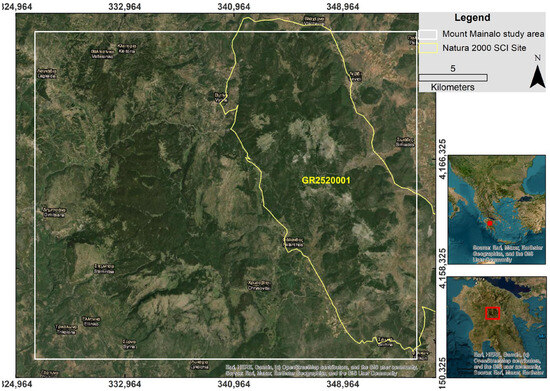 The study area of 672 km2 on Mount Mainalo, in the central Peloponnese, Greece, projected using the Greek Grid system (EGSA87). The red point and red square shown in the two corresponding locator maps indicate the location and extent of the study area.