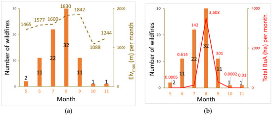 Frequency distribution histograms for the period from May 1998 to November 2022: (a) number of lightning-caused wildfires and maximum elevation of ignition points (Elvmax, m) per month; (b) number of wildfires and total BuA (ha) per month.