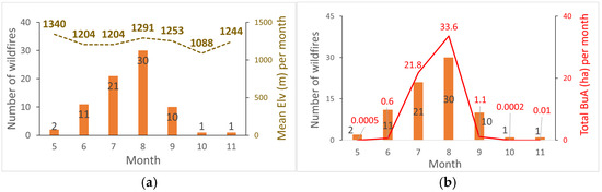 (a) Number of lightning-caused wildfires in the subset of 76 wildfires, each with a BuA not exceeding 15.9 ha and the mean Elv of ignitions per month, (b) number of wildfires and total BuA per month for the same subset.