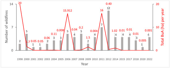 Number of lightning-caused wildfires and total BuA per year on Mount Mainalo, Greece, between May 1998 and November 2022.