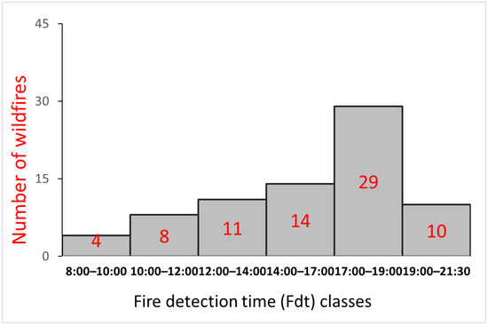 The frequency distribution of these 76 wildfires was also calculated based on empirical Fdt classes and is presented in Figure 5.