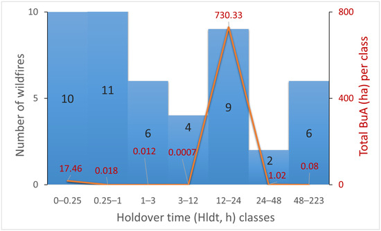 Hldt could not be calculated for 32 lightning-caused wildfires because either the precise fire detection time (Fdt) was not recorded or the duration of the associated thunderstorm was unavailable, making it impossible to determine the storm’s temporal midpoint. For the subset of 48 lightning-caused wildfires for which Hldt was calculated, seven (7) empirical Hldt classes were defined. A frequency distribution histogram was produced for these cases based on the Hldt classes, along with the total burned area (BuA) per class (Figure 6).