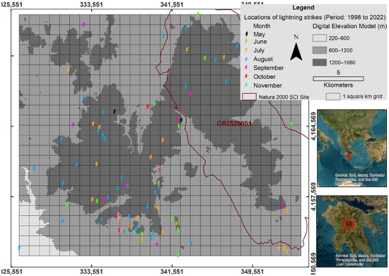Spatial and monthly temporal distribution of wildfire ignition points caused by lightning on Mount Mainalo, Greece, from 1998 to 2022.