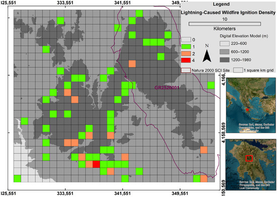 The ignition points of the 80 lightning-caused wildfires and their density per square kilometer are presented in Figure 7 and Figure 8, respectively. The lightning strike map (Figure 7) displays the precise strike locations and illustrates the spatial and monthly temporal distribution of 80 wildfire ignition points caused by lightning on Mount Mainalo, Peloponnese, Greece. Out of the 672 cells into which the 672 km2 study area was divided, 608 contained no recorded lightning-caused wildfires. One cell had four recorded, 13 cells recorded two each, and 50 cells had a single lightning-caused wildfire (Figure 8).
