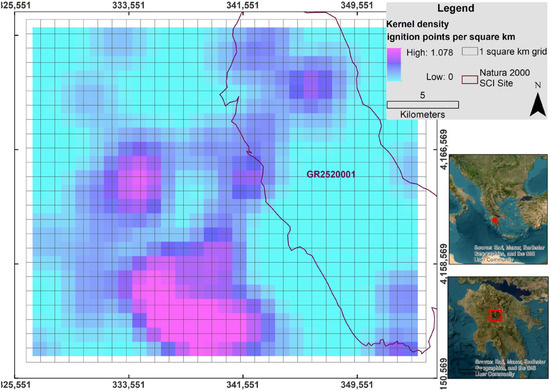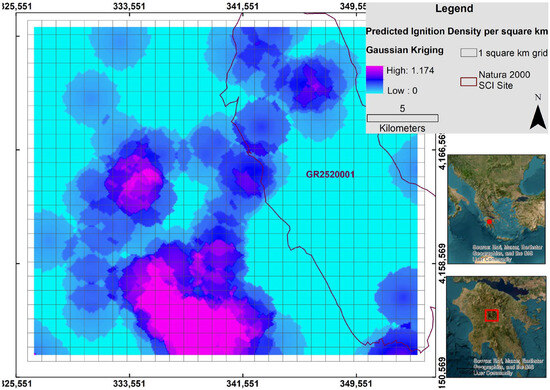 In general, during the fire season, lightning activity is positively related to elevation, slope, and woodland areas [42] in continental mountainous regions. Although fuel conditions, weather, climate, and topography significantly influence lightning-caused wildfires, the sensitivity of these wildfires to such factors must be well understood for different geographical locations [36]. Lightning-caused ignitions in complex terrain tend to be random, rapidly changing, and relatively independent. Therefore, although most lightning-caused wildfires have been recorded in the southern part of Mount Mainalo (Figure 10), destructive events may also occur in the northern or other areas of the mountain, as lightning ignitions are random and relatively spatially independent. To visualize the spatial density of ignitions across the landscape, we applied Ordinary Kriging with a Gaussian semivariogram model.