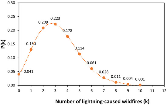 The next step was to estimate the kernel density of lightning-caused wildfires per square kilometer, visualizing the density across the landscape and highlighting the spatial intensity of ignitions. Ordinary Kriging [35] was then applied, using the Gaussian (normal) semivariogram model as a geostatistical interpolation method to estimate the density of lightning ignitions per square kilometer in unsampled areas. The average number of lightning-caused wildfires per season was calculated and used to estimate the probability of wildfire occurrence using the Poisson distribution, under the assumption that such events are random and independent. The resulting calculations covered the probability of observing between 0 and 10 wildfires per season based on the estimated seasonal average.