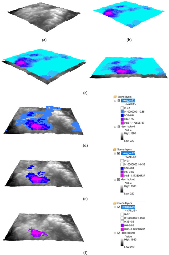 (a) Digital Elevation Model, (b,c) All Kriging density classes, (d–f) individual Kriging density classes shown separately.