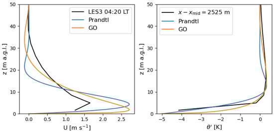 Analytical solutions of drainage flows from Prandtl and from Grisogono and Oerlemans (GO), both using , −5 K, 308 K, 0.015 K , and 9.8 m , compared to those during a steady, fully developed flow in LES3. Diffusivities in the Prandtl solution are constants, 0.015 , 0.02 , while the GO solution uses Pr = 0.75 and given by Equation (26).