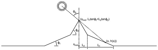 The intersection of this line and the terrain represents the location of the shadow front as it moves down the slope. Solving the linear system for this point results in a function of the solar angle,