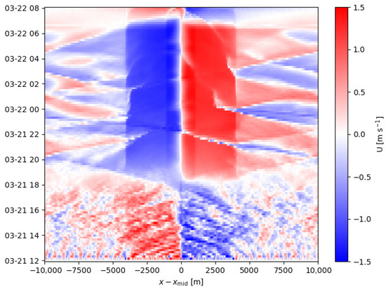 Hovmöller diagram of x-direction velocity at the first model half-level, ≈1.5 m a.g.l., averaged in the south–north direction from LES3 for the entire simulation period.