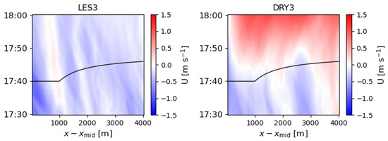 The analytical solution for the shadow front given by Equations (31) and (32) agrees quite well with the model output, manifested by a quick decrease in shortwave radiation incident on the terrain (Figure 6). The clear signal in radiation does not, however, translate to a clear signal in the x-direction velocity during the same sunset time period (Figure 7, left). While downslope flows eventually develop after sunset, the transition in LES3 (Figure 4 and Figure 5) is roughly an hour after the shadow completely encompasses the slope. Where a downslope flow is observed before sunset, 11 km, it appears attributable to subsidence associated with convective structures at 10.5 km and at 11.5 km (Figure 8).