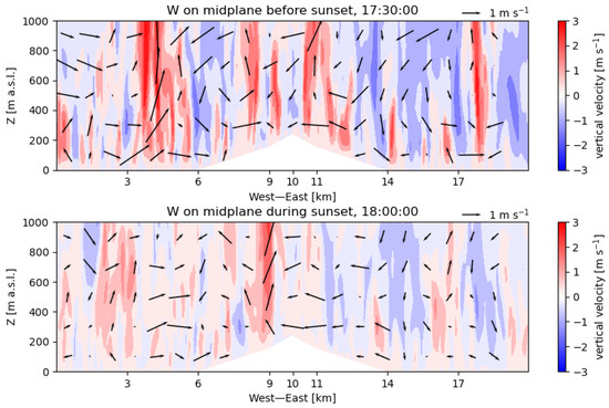 Cross-sections of vertical velocity shortly before and during sunset in LES3.