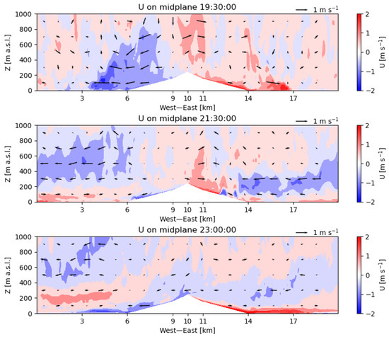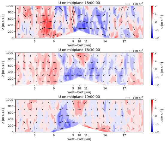 In the current simulations, the presence of convective structures post-sunset largely explains why the downslope flow initiates earlier on the sunnier western side than on the eastern slope. Because cooling by the surface boundary forces a drainage flow, this result may be counterintuitive. In Figure 9, we see horizontal convergence on the western slope at 18:00 LT (top), associated with the strong updraft near 9 km, as also evident in the contours of the vertical velocity from the same time (Figure 8). It is reasonable to expect that such convective updrafts more often persist on the western side of the mountain because this side receives insolation for longer than the shadowy eastern side. Over the next hour (Figure 9, middle and bottom), the easterly portion of the convergent flow near the mountain peak enforces the downslope flow on the western slope, while opposing it on the eastern slope. Thus, earlier and stronger downslope flows can occur on the side that receives insolation later in the evening.