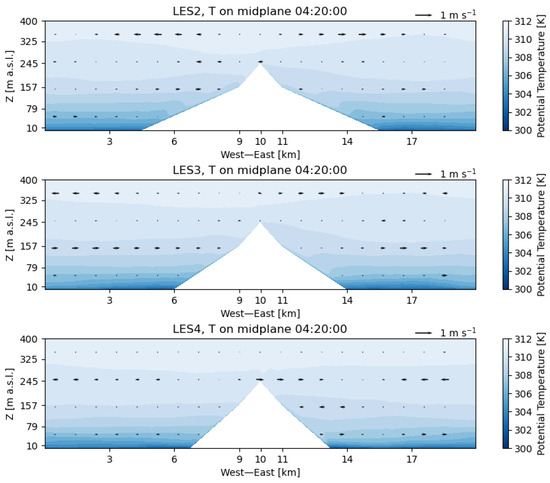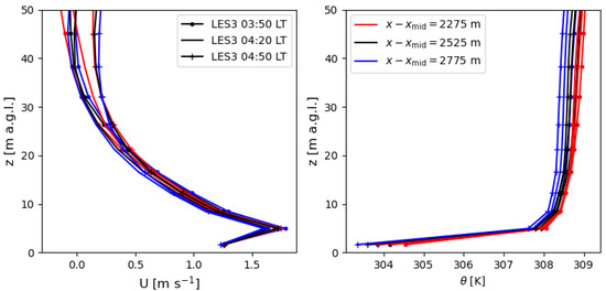 where m is the midpoint of the domain and m in all simulations. With this 2D terrain, variations in velocity and potential temperature due to resolved turbulence can be averaged out in the y (south–north) direction, so the profiles can be compared to those from the analytical solutions.
