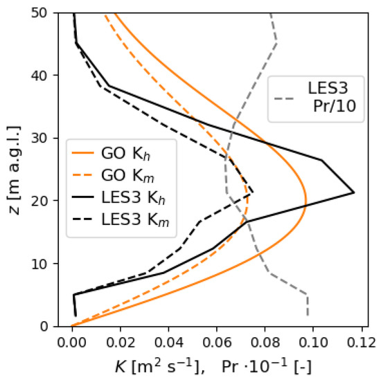 to compare with the Prandtl solution, as previously shown in Figure 2, from the LES results (Figure 13). In the LES, and are computed by the TKE 1.5-order turbulence closure [23,24] in WRF and vary in height. The Grisogono and Oerlemans solution allows for height variation but requires the specification of functional forms restricted by the additional requirement of a constant Prandtl number. We use the same functional form as Grisogono and Oerlemans [9] given by Equation (26), and tune the parameters below to match profiles from WRF,
