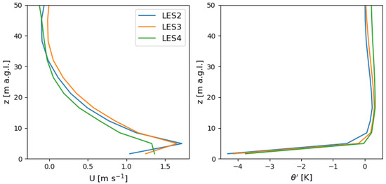 Velocity profiles from LES2, LES3, and LES4, at the middle of their lower eastern slopes, which have slopes of 2, 3, and 4 degrees, respectively. Profiles are taken at 04:20 LT at varied x, ensuring m to best control the strength of stratification between the LES results.