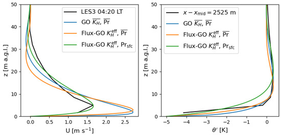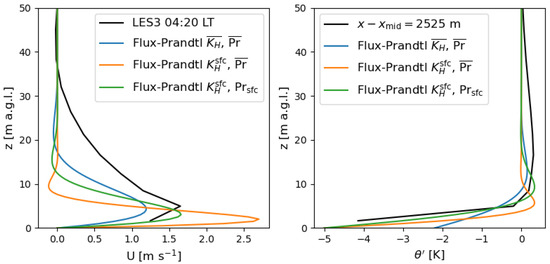 Profiles of velocity and potential temperature perturbation from new variants of the Prandtl analytical solutions compared to those from LES3. All solutions take , 308 K, 0.015 K , 9.8 m , and = −0.008 K m as the boundary surface heat flux. Other parameters are either the original resolved diffusivity (blue) or an effective diffusivity calculated with −5 K and either retaining a constant characteristic Prandtl number, Pr = 0.75 (orange), or by taking a larger value, Pr = 2, more representative of the surface (green).